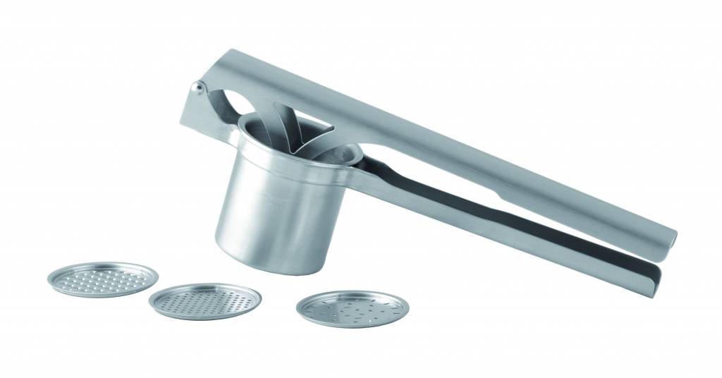 Puree squeezer, made of satin stainless steel 18/10. 3 types of templates included.