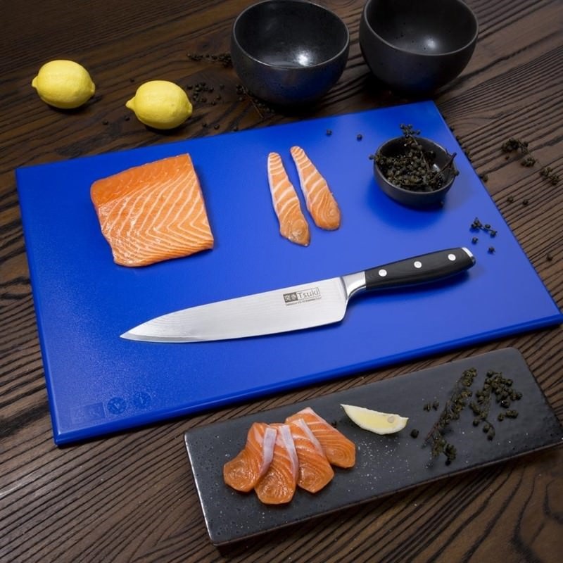 Make sure your food preparation is hygienic with the Hygiplas anti-microbial blue chopping board. Made using the latest developments in plastics technology, the high-density polyethylene board inhibits the activity of dangerous bacteria, helping prevent food poisoning. Colour coded blue for use with raw fish, the board is also easily identifiable to ensure your staff always use the right equipment and avoid cross-contamination. Boasting a durable and sturdy design, the board provides a dependable surface for chopping. (Sold singly).