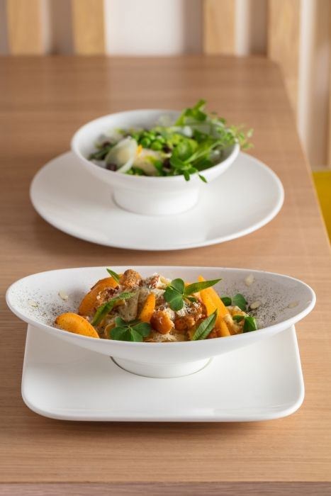 Taking its inspiration from tapas, AUREA includes highly stylish minimalist platters, featuring playful flat or curved shapes for deconstructed dishes. Every portion is a composition of delicacies to be sampled or shared on solid, stylish porcelain.