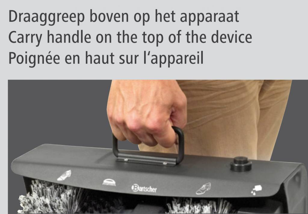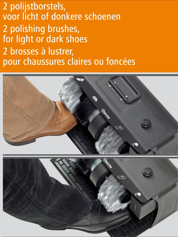 Equipped with | 3 quiet rotation brushes 1 cleaning brush for coarse dirt 2 polishing brushes made of terylene (polyester) for light and dark shoes Shoe cream dispenser with ball valve for 100 ml fluid shoes cream (unfilled) |