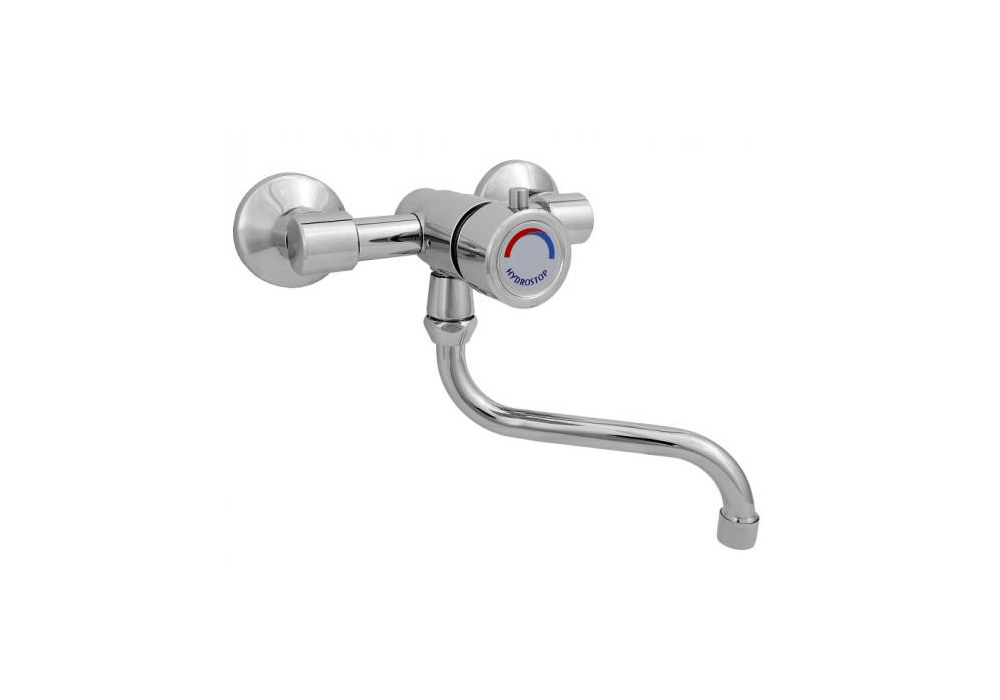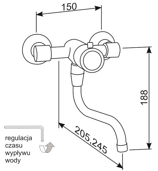 Self-closing wall-mounted basin mixer with hot and cold water mixer in the head. Can be connected in place of traditional washbasin faucets. Connection to the installation by means of eccentrics, standard spacing of connection sockets 150 mm. Water flow time adjustable from 5 to 15 seconds. Anti-limescale mechanism. The faucet is equipped with two check valves and mesh filters. Swivel spout - two possible lengths to choose from: 160 or 200 mm.