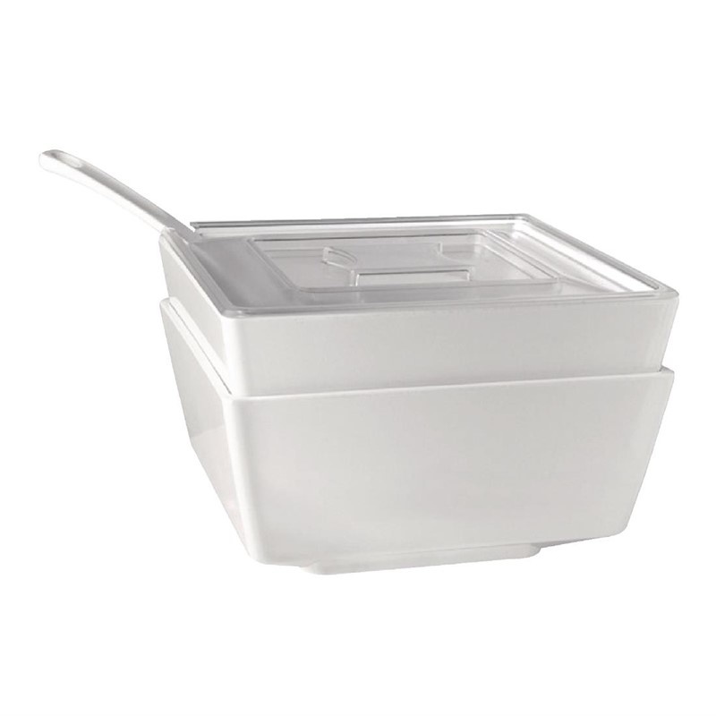 Elegant melamine APS white square bowls with a distinctive base which gives the impression of floating at the edge of the table. Clear edges and smooth surfaces are combined with durability to achieve a timeless and classic appearance.