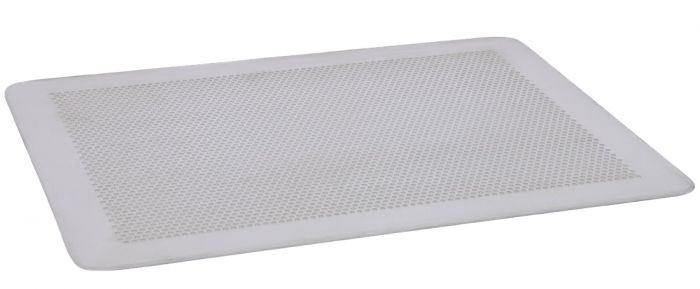 Thick aluminium 15/10° No edges for optimized space = enables to put the baking paper or mat completely flat. Perforations ø 3 mm for an homogeneous cooking