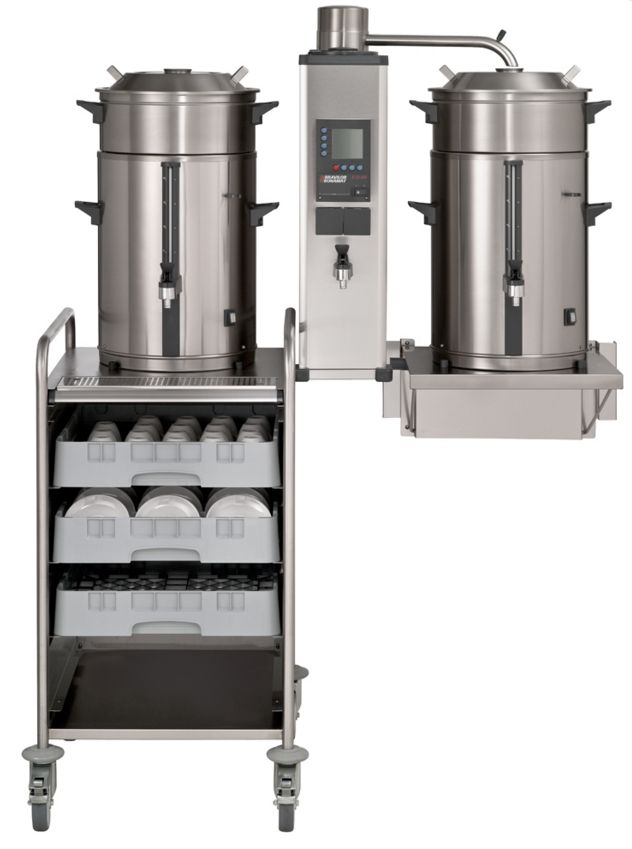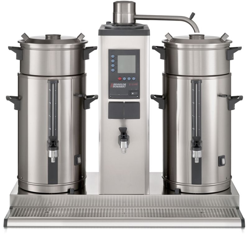 Round filtering machine with separate hot water tap to be mounted onto the wall. For locations with water connection. The B10 HW W brews large quantities of coffee into separate containers. Equipped with digital display, total and day counters, descale system, coffee-is-ready signal, built-in timer and optimum security provisions. Including container(s) type VHG, filter unit(s) and wall console for brewing column.