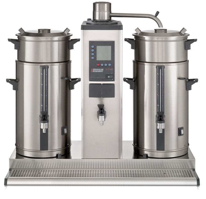Round filtering machine with separate hot water tap to be mounted onto the wall. For locations with water connection. The B20 HW W brews large quantities of coffee into separate containers. Equipped with digital display, total and day counters, descale system, coffee-is-ready signal, built-in timer and optimum security provisions. Including container(s) type VHG, filter unit(s) and wall console for brewing column.