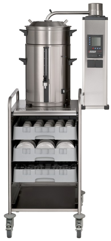 Round filtering machine to be mounted onto the wall for locations with water connection. The B40 W brews large quantities of coffee into separate containers. Equipped with digital display, total and day counters, descale system, coffee-is-ready signal, built-in timer and optimum security provisions. Including container(s) type VHG, filter unit(s) and wall console for brewing column.
