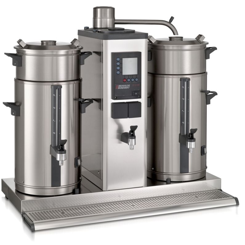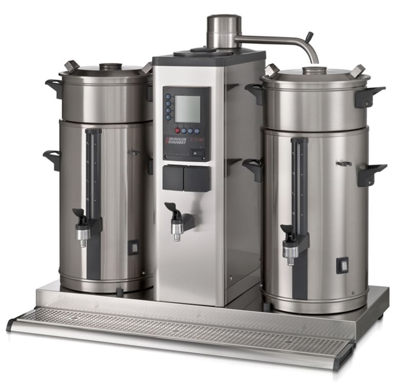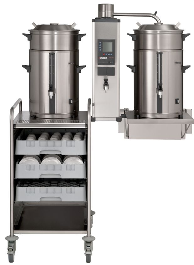 Round filtering machine with separate hot water tap to be mounted onto the wall. For locations with water connection. The B5 HW W brews large quantities of coffee into separate containers. Equipped with digital display, total and day counters, descale system, coffee-is-ready signal, built-in timer and optimum security provisions. Including container(s) type VHG, filter unit(s) and wall console for brewing column.