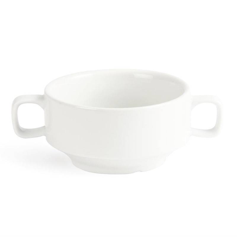 Great value pure white porcelain soup bowls with handles by Olympia, for your day to day catering needs. Durable and versatile these 4 1/2" bowls are easily stackable and contain strengthened rolled edges for chip resistance.