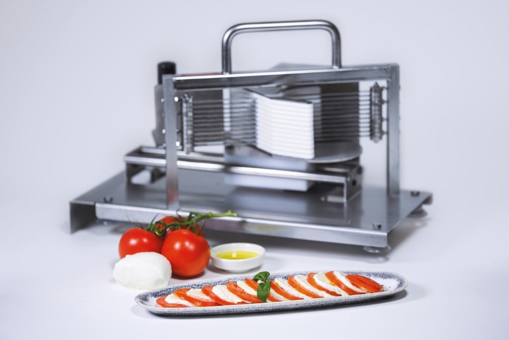 For cutting mozzarella and tomatos into uniform slices • The perfect tool for preparing Caprese regularly • Made of stainless steel • Stable construction of frame and guide rails • Special grinded teeth for a very clean cut and pusher optimized for cutting tomatos and mozzarella • Interchangeable blades • Elevated for ejection directly into a 65 mm deep GN container • Cutting thickness 5.5 mm • Dishwasher-suitableSpecifications