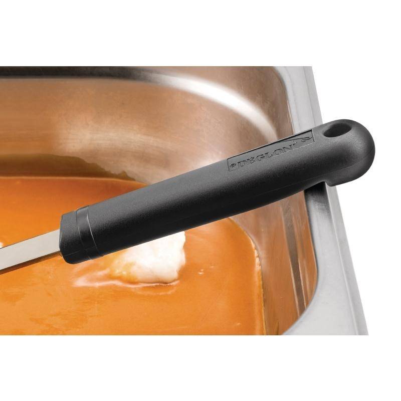 Functional, reliable and effective, this large soup ladle from Déglon Sabatier is ideal for stirring and serving soups, broths and stews. Featuring an ergonomically designed polypropylene handle, the ladle is incredibly comfortable and secure in the hand, helping you plate food quickly and accurately. The handle also features a notch allowing the utensil to rest securely onto a bowl or tray, preventing it from slipping into the food or falling on the floor. Made from stainless steel, the utensil is incredibly robust, heat resistant up to 120°C (248°F) and dishwasher-safe, making it perfect for use in any busy commercial kitchen.