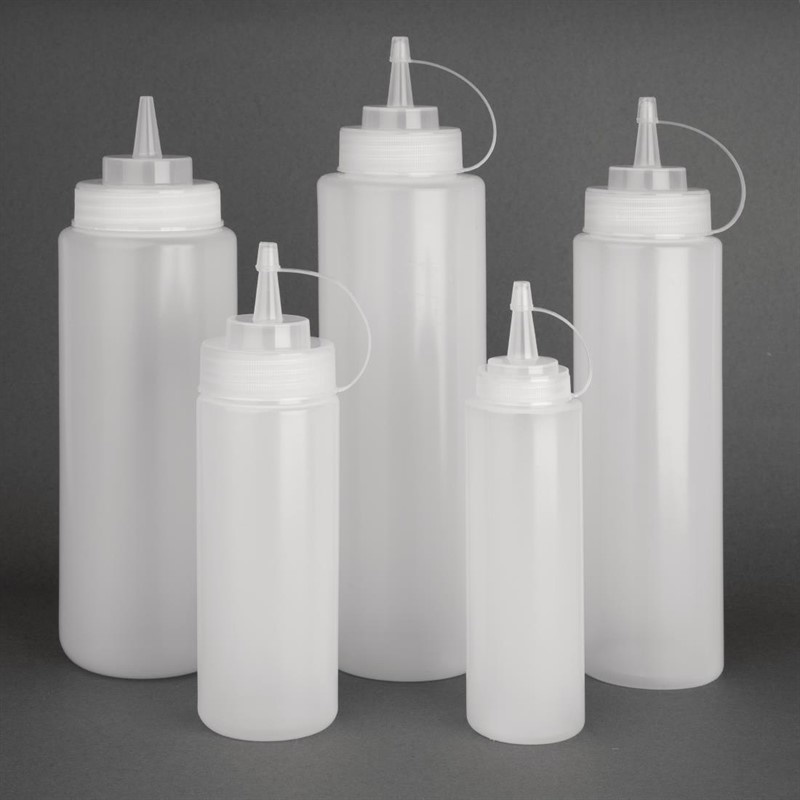 Store a variety of sauces with the Vogue 35oz clear squeeze sauce bottle. Constructed from robust and translucent polyethylene, the bottle is resistant to breaking and can be used as a container for any sauce, making it ideal for holding everything from mayonnaise to salad dressings. Made with a wide neck design and screw top, the bottle can be refilled with ease, preventing any spills in your premises. Featuring a thin nozzle, the bottle also allows you to apply sauces with accuracy, helping you give your dishes a professional finish. (Please Note: the nozzle must be trimmed for general sauce dispensing).