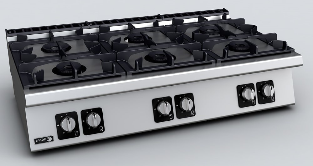 Deep drawn tops made of stainless steel AISI-304 with a thickness of 1.5 mm. Double grids with dimensions 397 x 580 mm (397 x 290 mm for each burner), allowing for large pots and pans. The reduced distance of 75 mm between the middle bars allows the use of pots with a very small diameter (8 cm), while avoiding the risk of falling smaller vessels. The burners are made of cast iron enamelled RAAF (resistant to alkaline and acid products, fire and high temperatures) .Palniki and diffusers with a double crown made of nickel-plated iron, which ensure a uniform distribution of heat from the flame to the base of the dishes, even in the case of large vessels. Flexible gas pipe of stainless steel, internal to facilitate manipulation in order to facilitate repairs. Access to serviceable components from the front. Six burners on the counter with different powers, allowing the use of different pots and pans and the different dishes: 4 x 5.25 kW (diameter 100 mm) + 2 x 8.0 kW (diameter 120 mm).