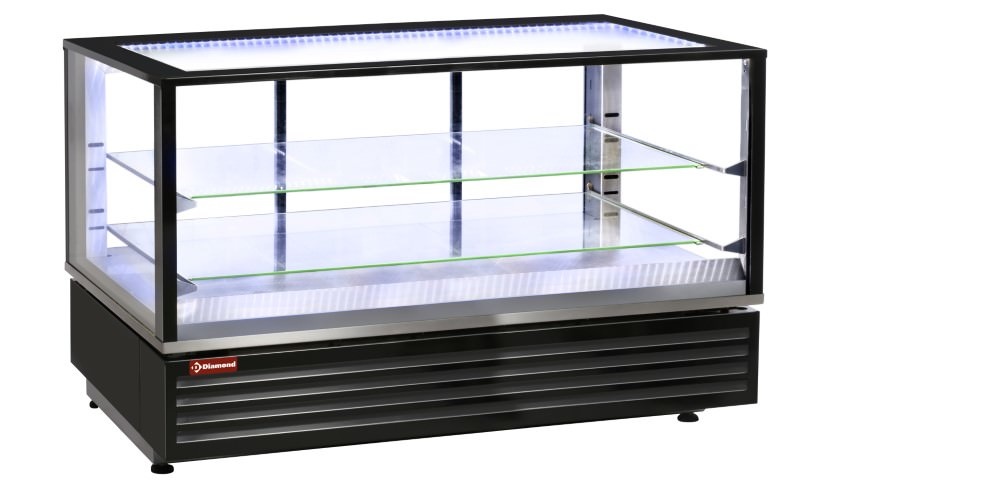 - 2 presentation shelves (removable) made of tempered glass (0.4 mm). - Sliding doors on the service side, removable (easy to maintain).