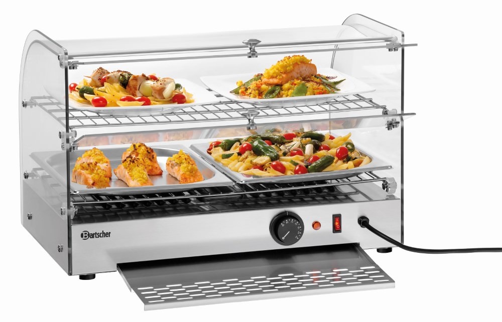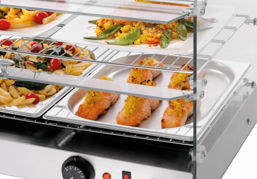 Compact table top unit for keeping food warm and presenting hot meals – equipped with practical lifting doors.