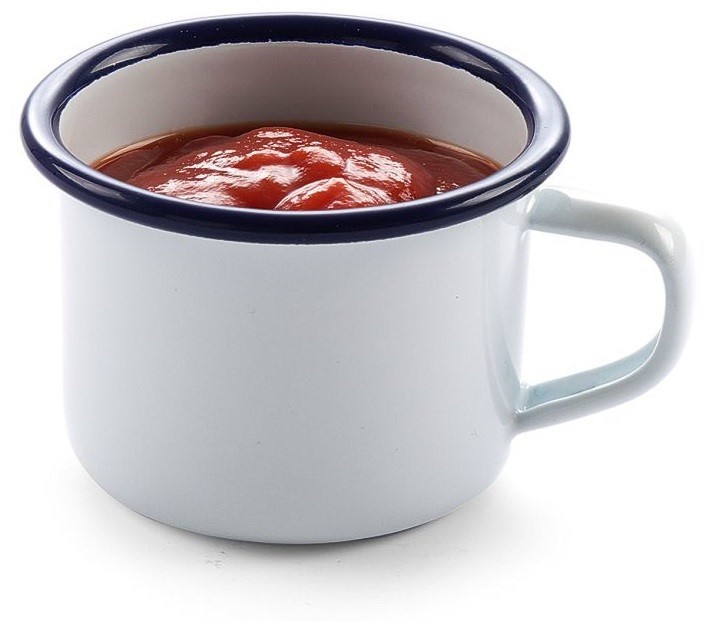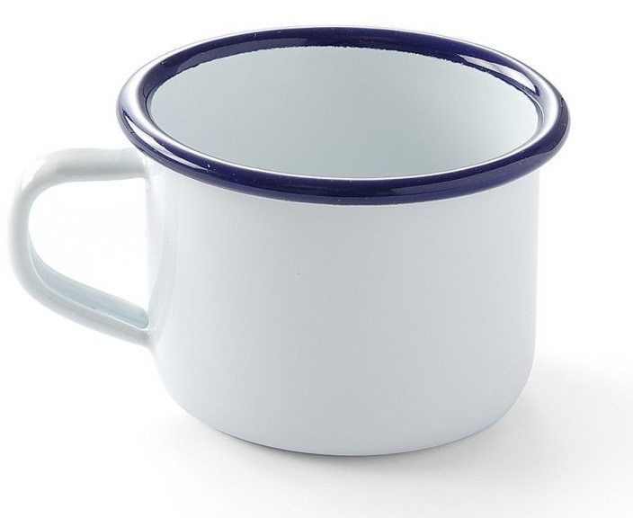 Enamelled tableware has made a comeback. White enamelled steel with a nice blue border. High quality enamel. Abrasion resistant.