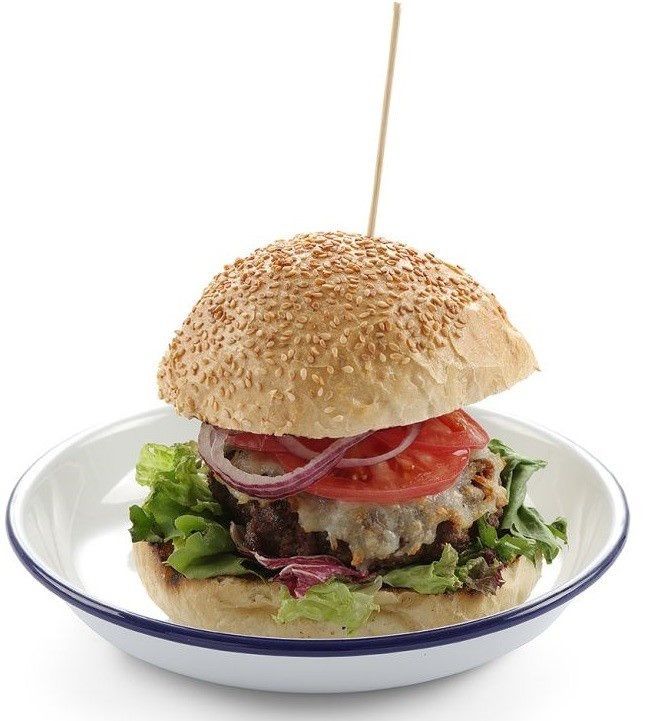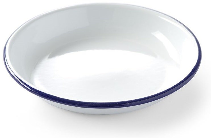 Enamelled tableware has made a comeback. White enamelled steel with a nice blue border. High quality enamel. Abrasion resistant.