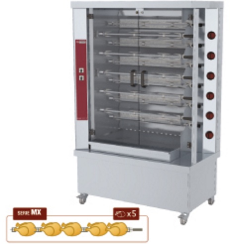 - Capacity 6 chickens per spit, all the spits are delivered with 2 final and 4 intermediate picks, with athermal handle.