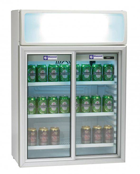 Temperature: + 2 ° + 10 ° Photos - internal volume of 100 liters. Photos - Internal dimensions: 560 x 265 x h635 mm. Photos - Capacity: 96 cans (330 ml) and 64 bottles ( 500 ml). Photos - Attached 3 shelves 560 x 210 mm, removable and adjustable. Photos - glass sliding doors, Thermopane®. Photos - lighted chamber. Photos - interior lighting. Photos - the mechanical thermostat T ° + 2 ° + 10 °. Photos - Analog thermometer to show internal temperature. Photos - Built hermetically sealed unit, the distance ambient temperature of + 32 °. Photos - ventilated evaporator, refrigerant R134A distributed capillaries.