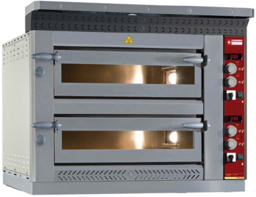 Efficient and sturdy pizza oven stainless steel. The device has two chambers inserted chamotte, covered heating elements, glazed doors and independently adjustable upper and lower heaters. The maximum temperature is 450 ° C.