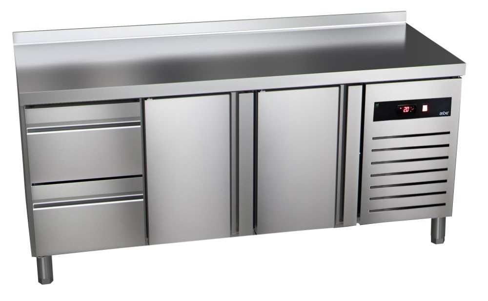 Double Door Refrigerated Table with Splashback and 2 Drawers 199 L, from -2 °C to 8 °C, Side-Mounted Compressor