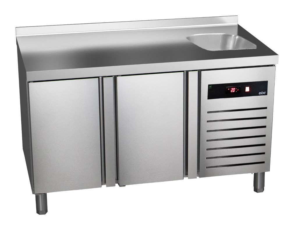 Double Door Refrigerated Table with Splashback and Sink 153 L, from -2 °C to 8 °C, Side-Mounted Compressor
