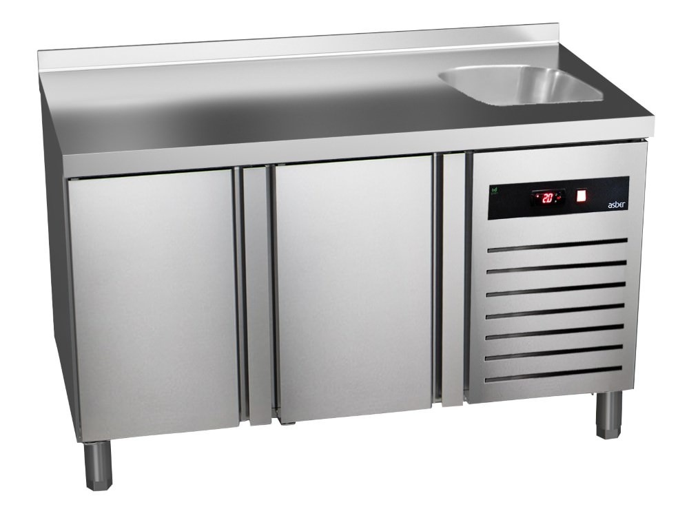 Double Door Refrigerated Table with Splashback and Sink 143 L, from -2 °C to 8 °C, Side-Mounted Compressor