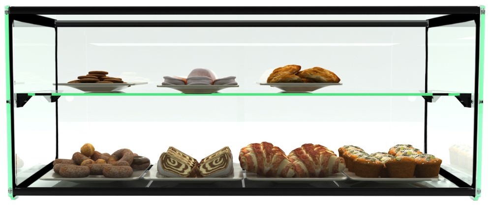 for the presentation of food and other products that do not require cooling • increase your sales through ideal visibility of your products • all glasses strengthened • additional shelf 900 x 300 mm for more exhibition space • top edge impact-protected with a glass protection profile • Flat Pack: Kit for easy self-assemblySpecifications