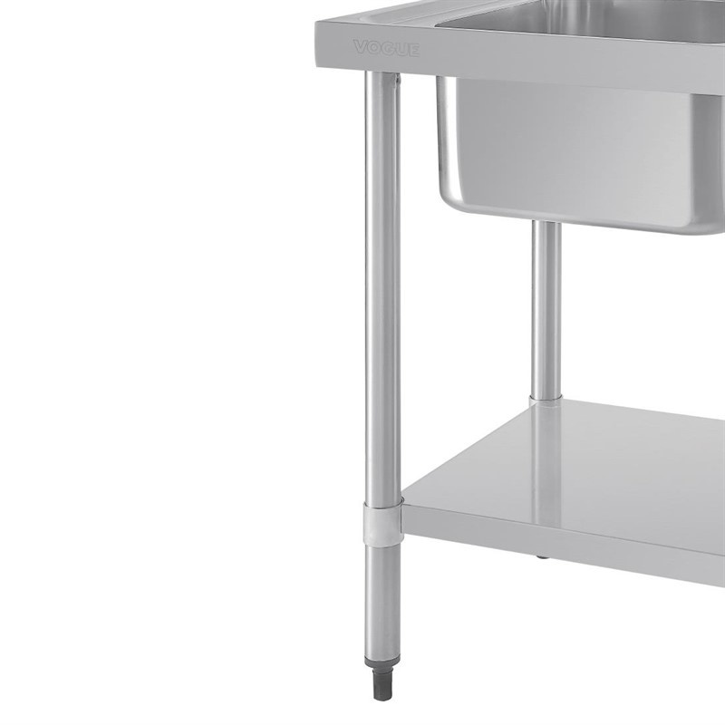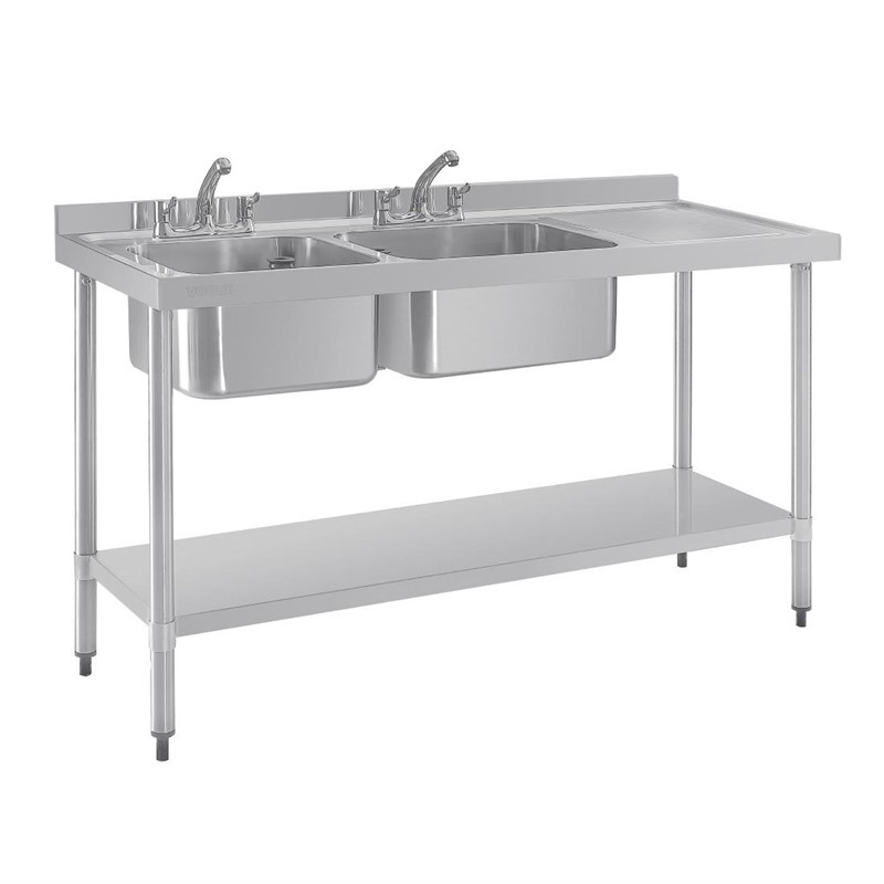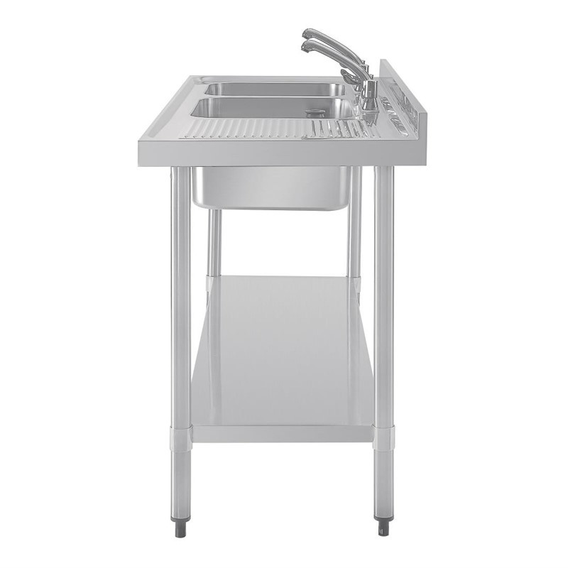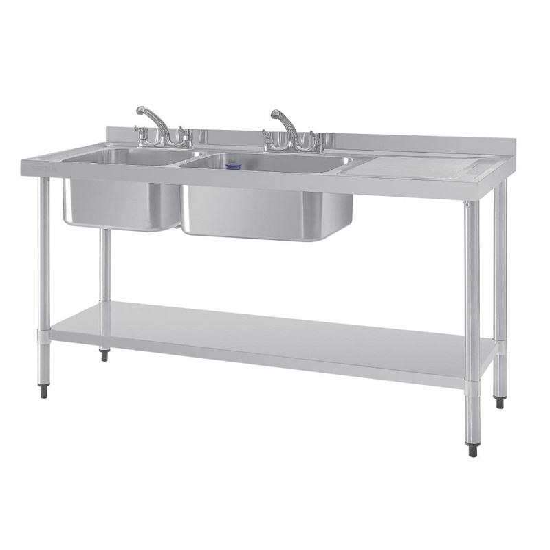 Fantastically priced 600mm deep units with raised lip all around to help prevent spillage and items slipping off and rear upstand which keeps items from falling behind the sink. Angled draining rack ensures water runs back to the sink to drain away, preventing pooling, speeding, drying and improving hygiene. Adjustable feet allow stable positioning on uneven surfaces whilst strong undershelf provides vital undersink storage for cleaning equipment and chemicals. Supplied with stand, shelf and waste. Taps sold separately.