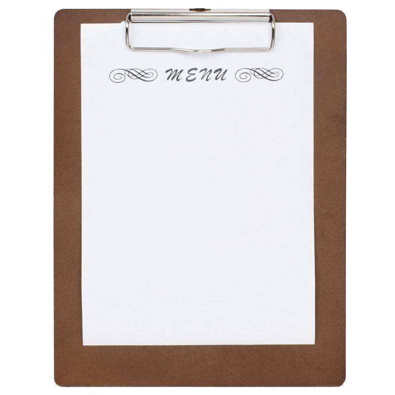 Charming wooden clipboards to display your menu. Complete the set with the ten notch menu stand.