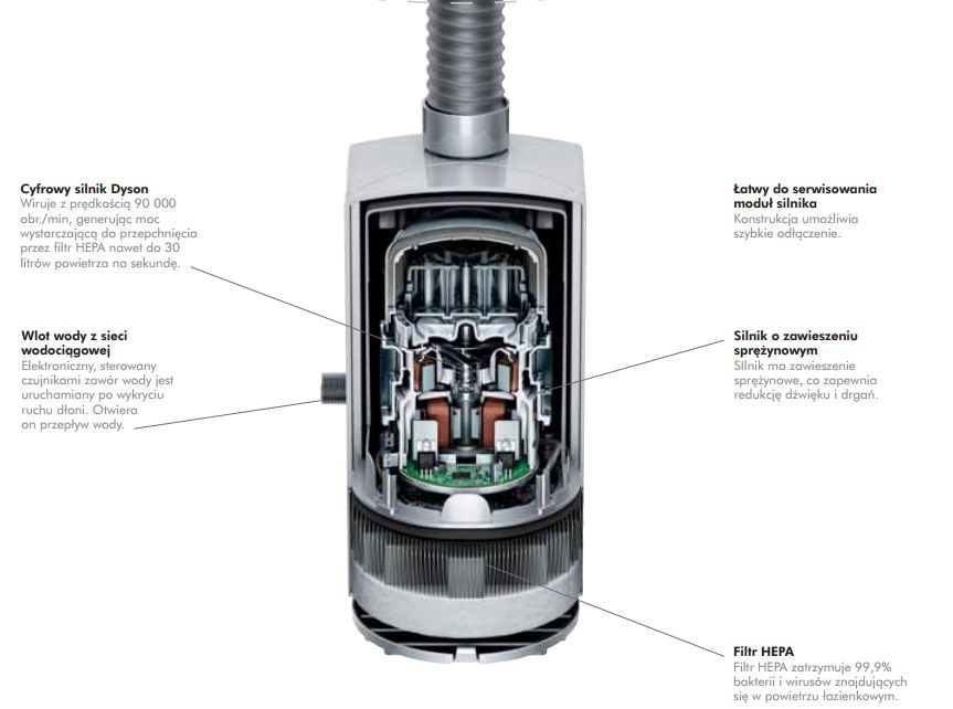 DYSON AIRBLADE ™ AB11 hand dryer dries hands in 12 seconds - collects water from hands like a car wiper. This is the fastest hand dryer - cleanses the air before directing it in hand, so it is also hygienic. In addition, it consumes up to 80% less energy than a traditional dryer. The air passes through two eyelashes with a width of eyelashes, thanks to which the air streams moving at 690 km / h are formed. Water is pulled from hands only in 12 seconds. This happens thanks to the new digital motor that rotates at 90,000 rpm.