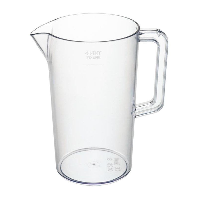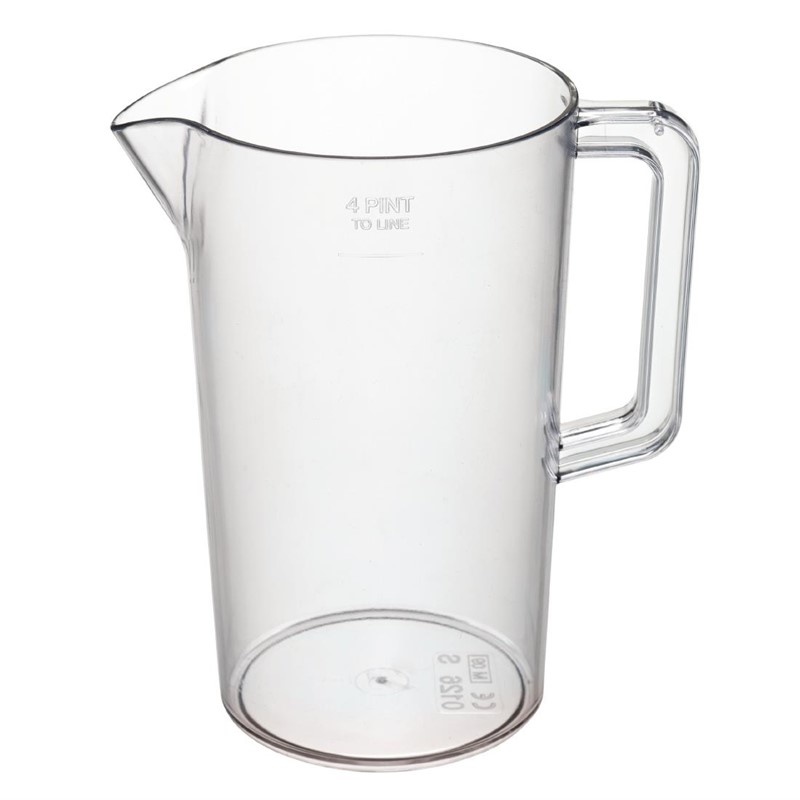 SAN is a more durable alternative to polystyrene. As such, this jug is lightweight and extra strong and makes an ideal beer jug, water jug and soft drink jug for bars, hotels and catering establishments. This strengthened pitcher is CE marked and lined at 4 pints. The handle has rolled edges for strength and a more secure hold.
