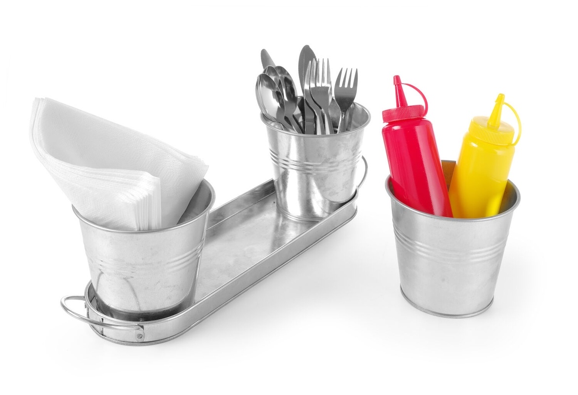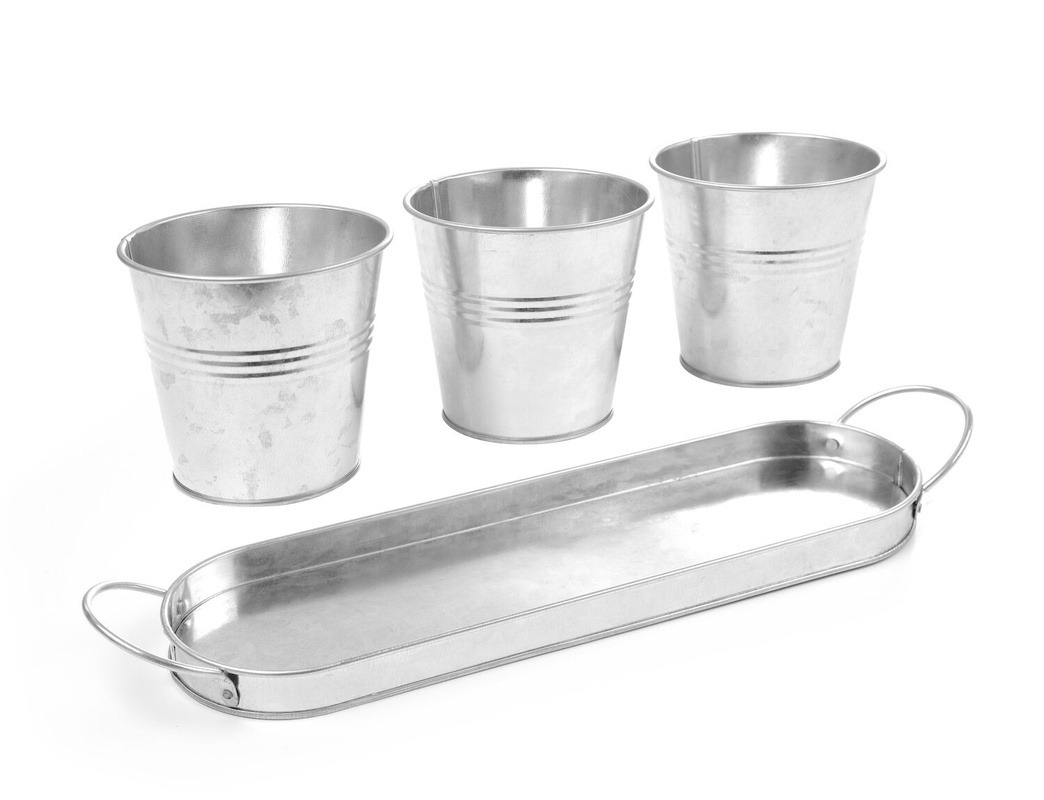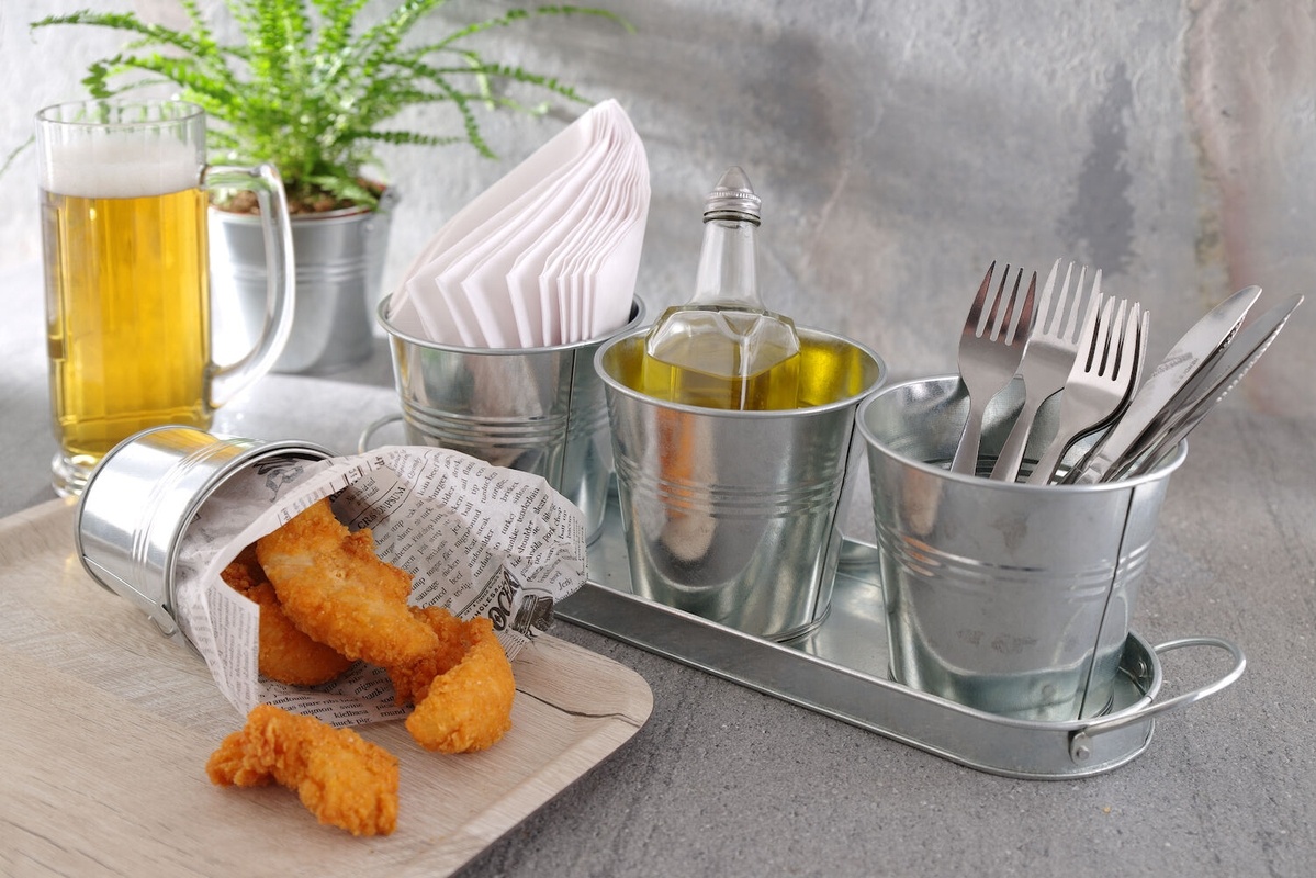 Made of galvanized sheet steel, this creates a rustic look. Galvanized steel isn't intended for food contact, line the buckets with our greaseproof paper sheets when using it for serving food.
