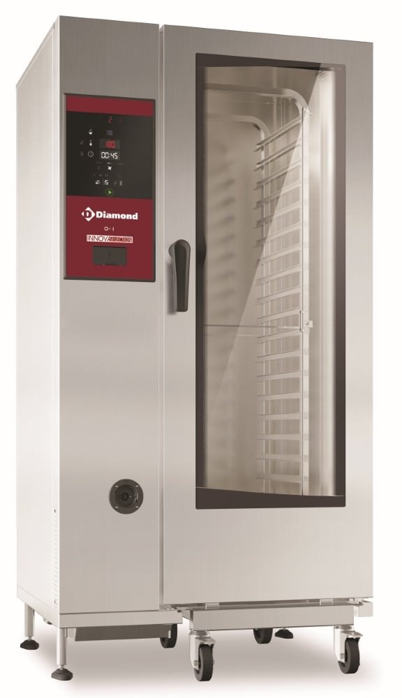 - Inner and outer construction in stainless steel AISI 304, thermal insulation in ceramic fibre, control panel with stainless steel filter, preventing soiling of the components (ventilated panel), stainless steel feet. - Cooking chamber: fully welded, completely watertight, rounded corners and angles without any roughness. Sealing gasket fixed on the front of the cooking chamber. Double-drawn bottom that separates condensation from the grease towards the drain. Standard steam condenser reducing the temperature of the condensate at the drain and limiting the steam outlet when the door is opened. Easily removable platinum door structure. Easily removable heat diffusers. Large motorized door allowing all types of cooking. Unique design of the enclosure coupled with a side fan in AISI 304 stainless steel (CCRR), guarantee uniform heat management and distribution. - Double-glazed door: ergonomic and athermal handle, automatic closing with safety device to prevent accidental opening, condensate recovery unit integrated in the door, interior window mounted on hinges for easy cleaning and perfect hygiene. Air circulation between the panes of glass guarantees better thermal insulation. Micro-switch to stop the fan when opening. Side LED lighting for a global view of the enclosure. Electric heating: by circular stainless steel shielded resistors placed behind the fan deflectors, steam: by stainless steel shielded resistors in an external casing. Control panel (Thermostat from 25° to 300°C. - Timer from 1 min to 8 h, ...) with digital display: clear and logical design, front access, easy and quick after-sales service, IPx5 protection index (against water jets from the lance).