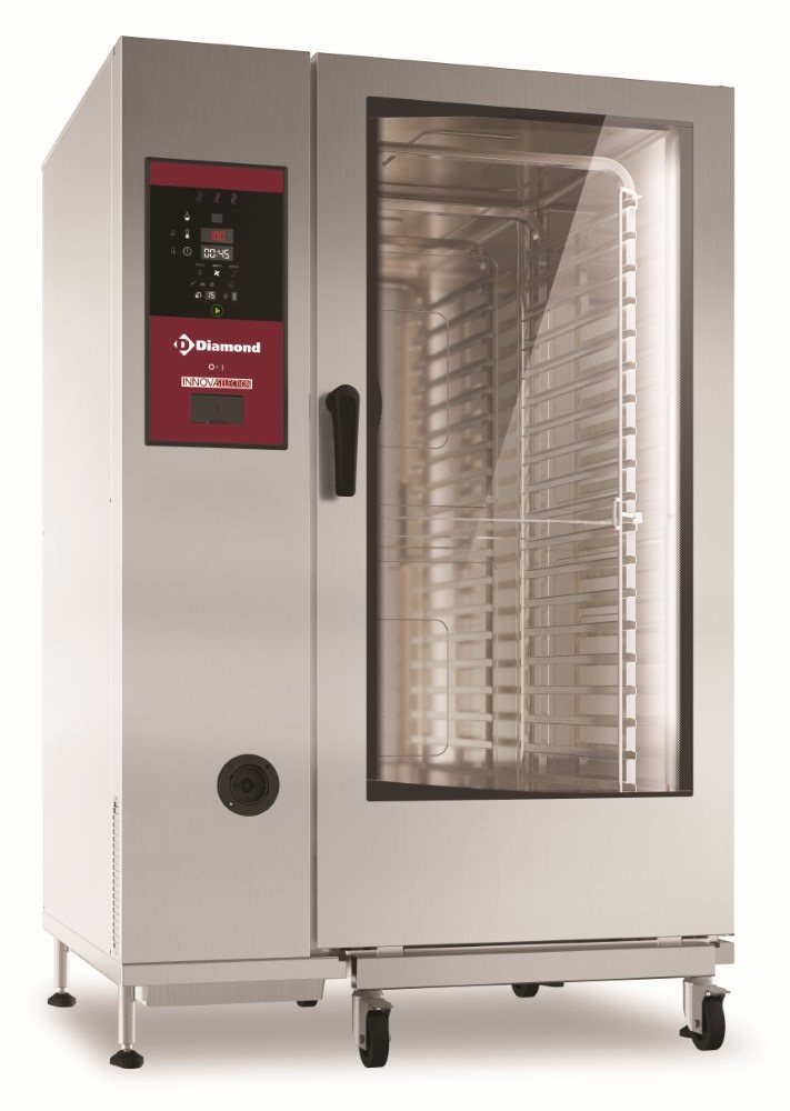 - Inner and outer construction in stainless steel AISI 304, thermal insulation in ceramic fibre, control panel with stainless steel filter, preventing soiling of the components (ventilated panel), stainless steel feet. - Cooking chamber: fully welded, completely watertight, rounded corners and angles without any roughness. Sealing gasket fixed on the front of the cooking chamber. Double-drawn bottom that separates condensation from the grease towards the drain. Standard steam condenser reducing the temperature of the condensate at the drain and limiting the steam outlet when the door is opened. Easily removable platinum door structure. Easily removable heat diffusers. Large motorized door allowing all types of cooking. Unique design of the enclosure coupled with a side fan in AISI 304 stainless steel (CCRR), guarantee uniform heat management and distribution. - Double-glazed door: ergonomic and athermal handle, automatic closing with safety device to prevent accidental opening, condensate recovery unit integrated in the door, interior window mounted on hinges for easy cleaning and perfect hygiene. Air circulation between the panes of glass guarantees better thermal insulation. Micro-switch to stop the fan when opening. Side LED lighting for a global view of the enclosure. Electric heating: by circular stainless steel shielded resistors placed behind the fan deflectors, steam: by stainless steel shielded resistors in an external casing. Control panel (Thermostat from 25° to 300°C. - Timer from 1 min to 8 h, ...) with digital display: clear and logical design, front access, easy and quick after-sales service, IPx5 protection index (against water jets from the lance).