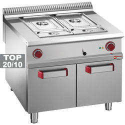 - Chimney in the back in stainless steel AISI 304. "Stamped" tank in stainless steel AISI 304 welded (continuous), with all corners and interior corners rounded for easy and hygienic maintenance, a drain valve (bullet) is placed on the front of the unit. Electric heating by stainless steel armored heating elements, placed below the bottom of the tank, outside. Regulation from 30°C to 90°C, frontal accessibility allowing a very easy maintenance.