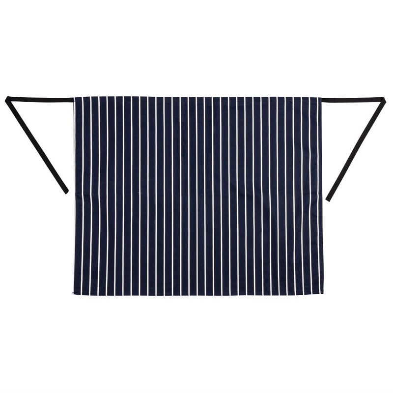 Durable and hardwearing easycare waist apron with sewn in ties. Standard length, featuring a bold navy and white butchers stripe design.