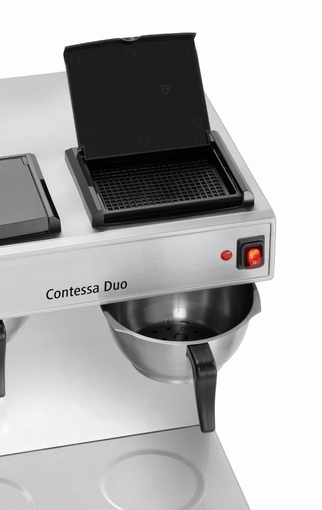 The perfect coffee machine for filter coffee counters at buffets, for catering, and at events. With the Contessa Duo, up to 13 cups of coffee can be brewed directly into the thermal jug per hot plate. The improved stainless steel heating elements provide optimised heat transfer.