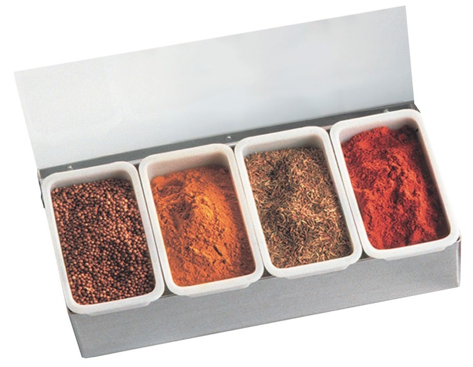 perfect for the storage of sprinkles, nuts, candies and decorations • ingedients are highly visible and hygienically protected • oranised storage of Ingredients at the work station • stainless steel casing • 4 plastic containers • with transparent lidSpecifications