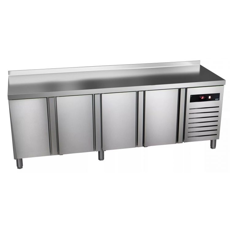 Four Door Refrigerated Table with Splashback 285 L, from -2 °C to 8 °C, Side-Mounted Compressor