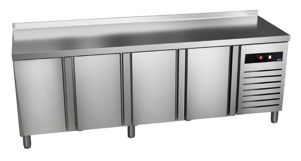 Four Door Refrigerated Table with Splashback 285 L, from -2 °C to 8 °C, Side-Mounted Compressor