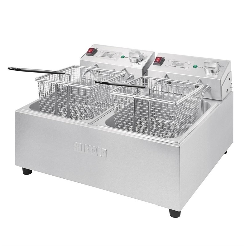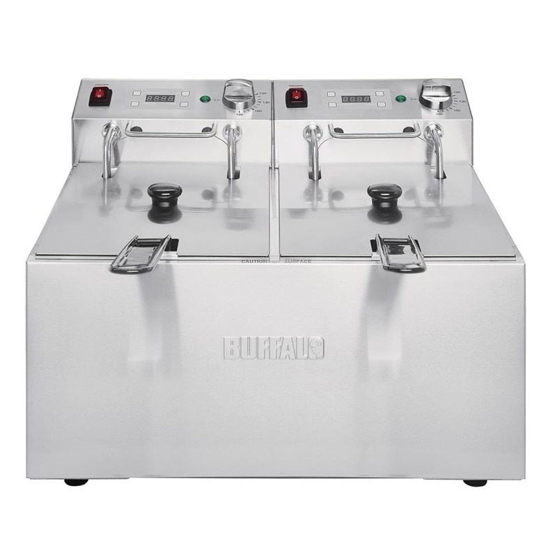 Whether you're frying up fish, chips, chicken or onion rings, the Buffalo double fryer is a reliable solution for professional kitchens. With two independent 5 litre tanks, each with independent controls and power leads, you have all the flexibility to cook as much - or as little as is required. Built-in timers ensure accurate frying and consistent results, whilst the simple stainless steel construction makes the unit easy to clean and maintain.