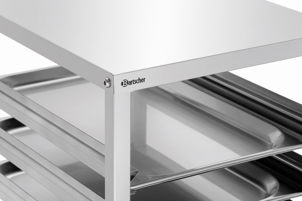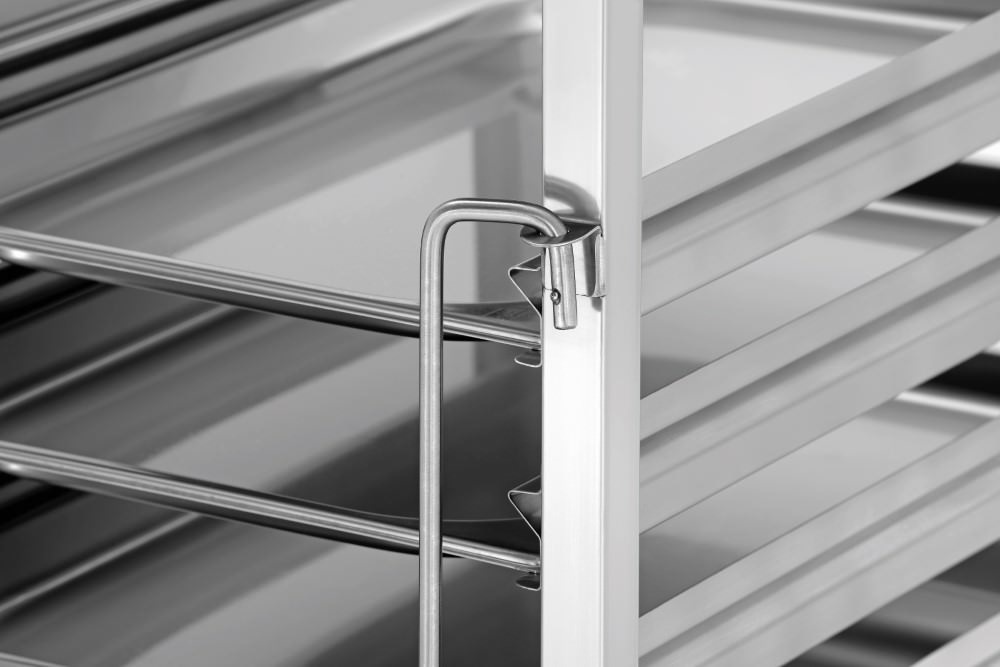 Clearing trolley with 7 slots and additional useful storage space. The container latch on both sides prevent the container from slipping.