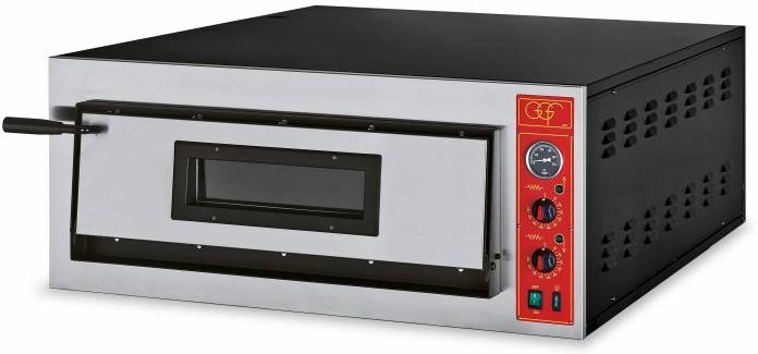 Professional pizza oven provided with a cooking chamber designed and optimized for a pizza having a diameter of 36 cm. Front available with a stainless steel finish or rustic. The device is adjustable by means of independent mechanical thermostats for both the top and bottom of the furnace insulation evaporated mineral wool of high density, the surface of the baking stone refractory pyrometer and internal lighting halogen. Available with electronic temperature regulator with a digital display.