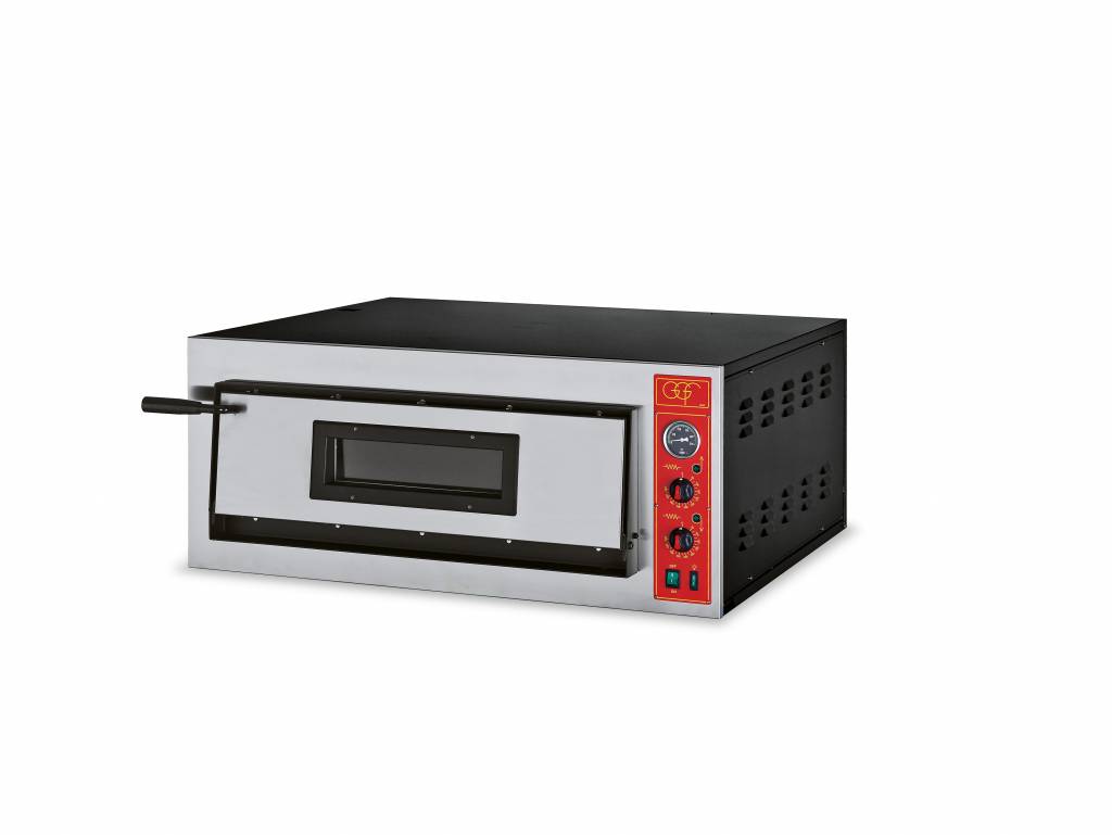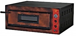 Professional pizza oven provided with a cooking chamber designed and optimized for a pizza having a diameter of 36 cm. Front available with a stainless steel finish or rustic. The device is adjustable by means of independent mechanical thermostats for both the top and bottom of the furnace insulation evaporated mineral wool of high density, the surface of the baking stone refractory pyrometer and internal lighting halogen. Available with electronic temperature regulator with a digital display.