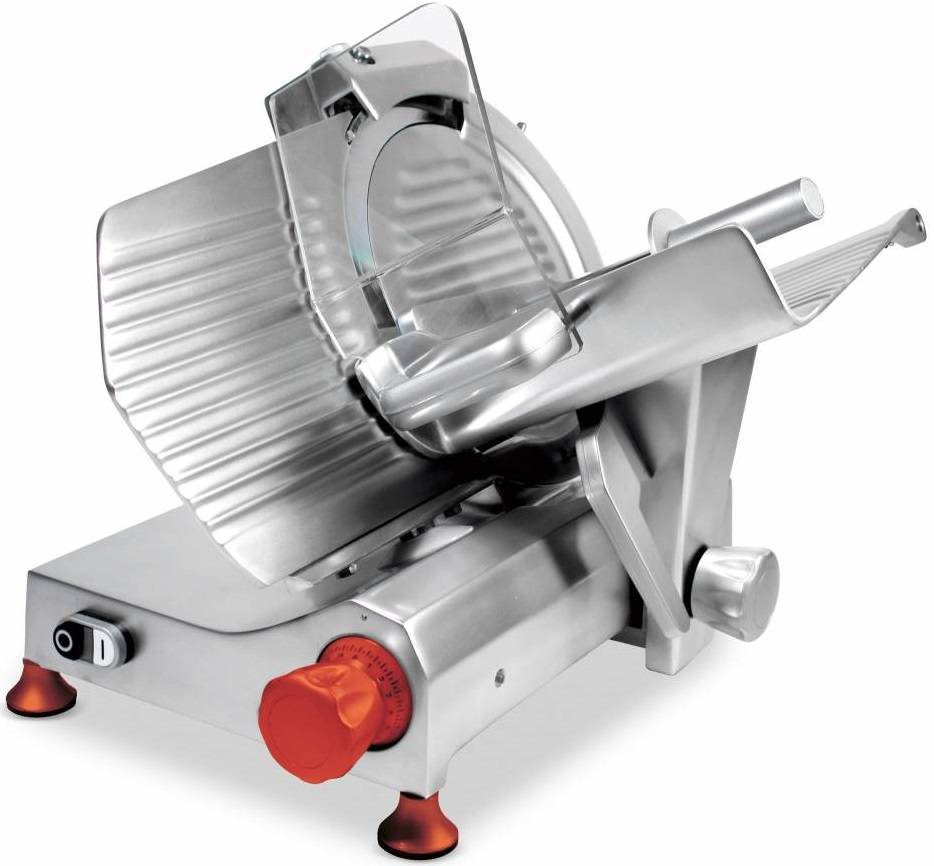slicer sausages made of anodized aluminum with a guide mounted on ball bearings to ensure smooth and efficient operation. The device is equipped with obliquely mounted hardened stainless steel blade with a diameter of 300 mm, the knob for adjusting the thickness of the cutting blade and a cover. Removal of the blade is powered by an engine power of 300 W.