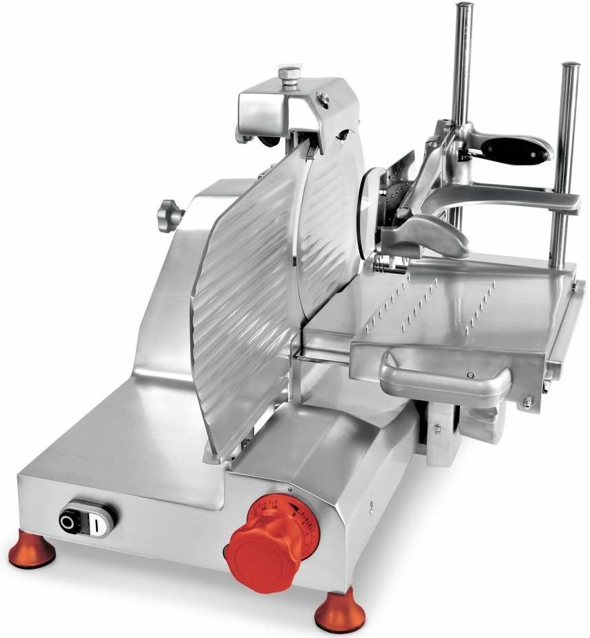 The vertical cutter sausages made of anodized aluminum with a guide mounted on ball bearings to ensure smooth and efficient operation. The device has a hardened stainless steel blade with a diameter of 300 mm, the knob for adjusting the thickness of the cutting blade and a cover. Removal of the blade is powered by an engine power of 270 W.