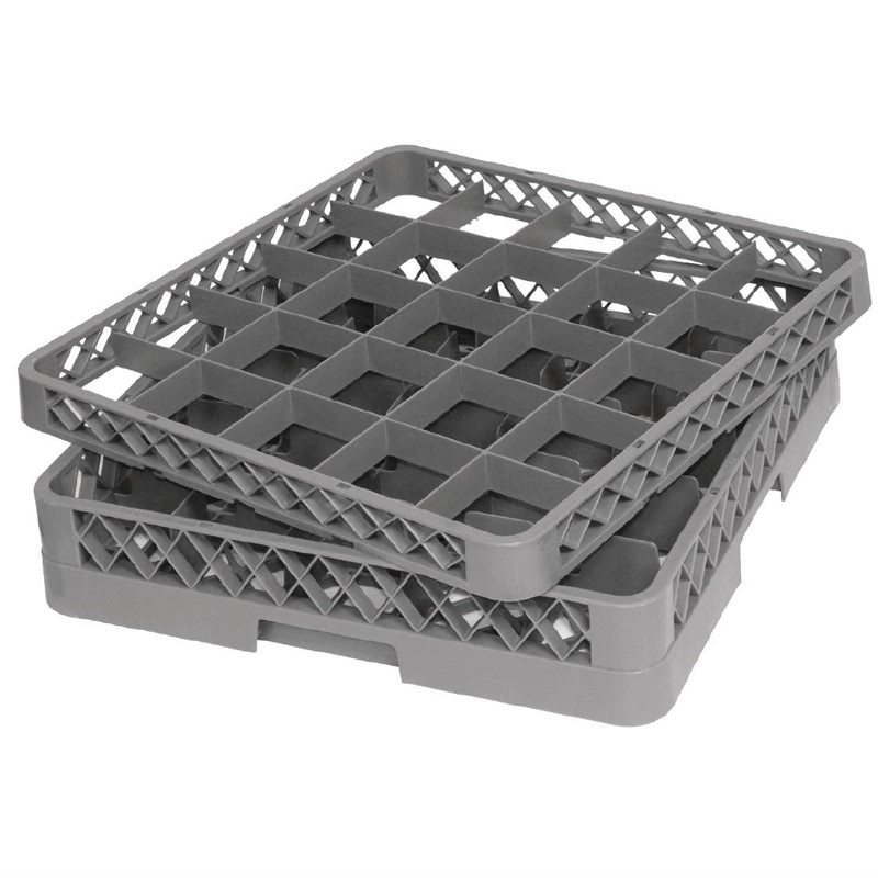 The grey glass rack extender from Vogue is designed to snap onto glass racks and extend height for taller glasses or cups, offering added stability and support for glasses such as champagne flutes and wine glasses. This 25 compartment rack extender is compatible with the Vogue 25 compartment glass rack (F613), holding glasses with a diameter of 86mm or smaller.