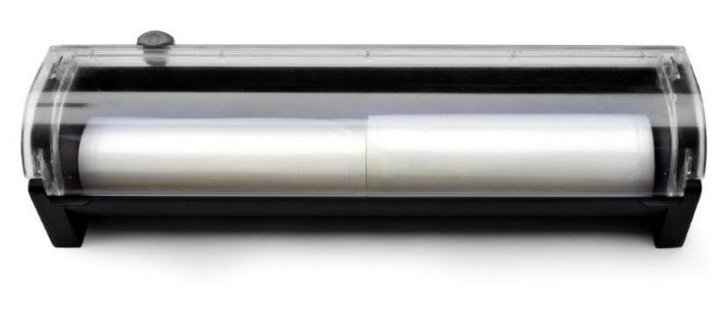 Can be attached to vacuum packaging machine Kitchen Line 975374 or as a stand-alone attachment for other vacuum packaging machines. Equipped with a removable knife to cut exactly the needed bag length. Internal dimensions: 412x101x(H)101 mm. For rolls with maximum dimensions of ø100x400 mm. Base made of. ABS. Transparent polycarbonate cover for easy control of the roll.