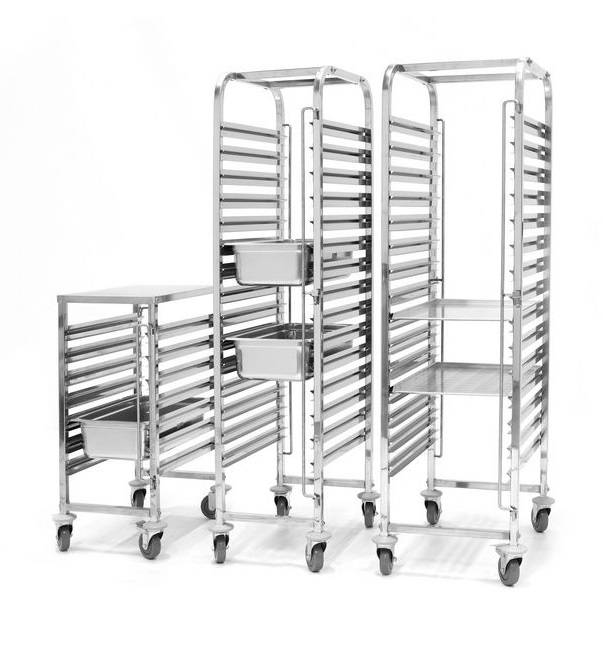 The trolley GN 12 positions dimensions GN 1/1 and a height of 1000 mm. Trolley is equipped with two-sided protection against falling containers. It is perfect for large and small catering, the catering companies, schools or hospitals. Supplied in flat pack for self-assembly.