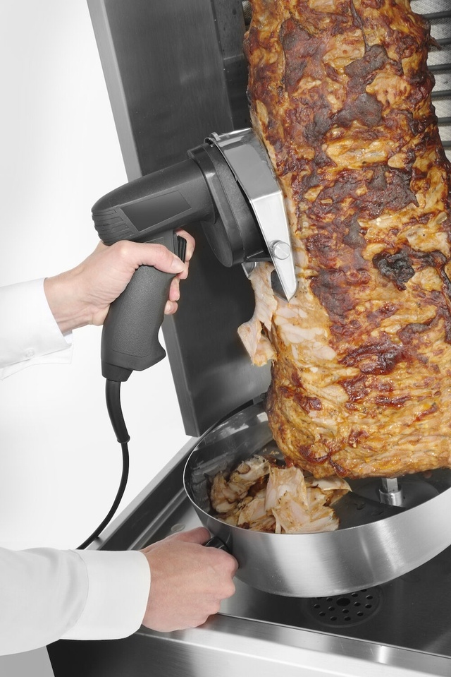 For slicing döner kebab, shawarma, gyro, etc. 2 stainless steel ø100 mm blades, 1 smooth and 1 serrated. Blade spins at 2600 RPM and can slice up to 60 kg/h. Easily adjustable slicing thickness from 0 mm up to 8 mm. Blade cover made of stainless steel ensures safety during cutting. Handle and motor housing made of anti-slip material. ON/OFF switch integrated with the housing. Overload protection with a reset button. Blade sharpening stone included. Weight 1 kg.